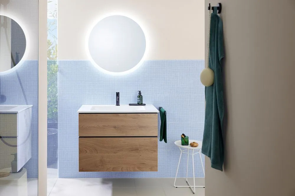 Für Eqio steht eine Auswahl an eckigen und kreisrunden Spiegeln unterschiedlicher Größe mit LED-Beleuchtungsvarianten zur Verfügung sowie zu allen Waschtischbreiten passende Spiegelschränke mit guter Ausstattung und optionaler Waschtischbeleuchtung. Ergänzt wird das Programm durch Hochschränke und Halbhochschrank, offenes Regalfach, Handtuchhalter sowie passende Stoffkörbe für Regal und Wäschekippe (neu). Ein weiteres Extra ist die optionale dimmbare LED-Waschtischunterschrankbeleuchtung für ein stimmungsvolles Ambiente.